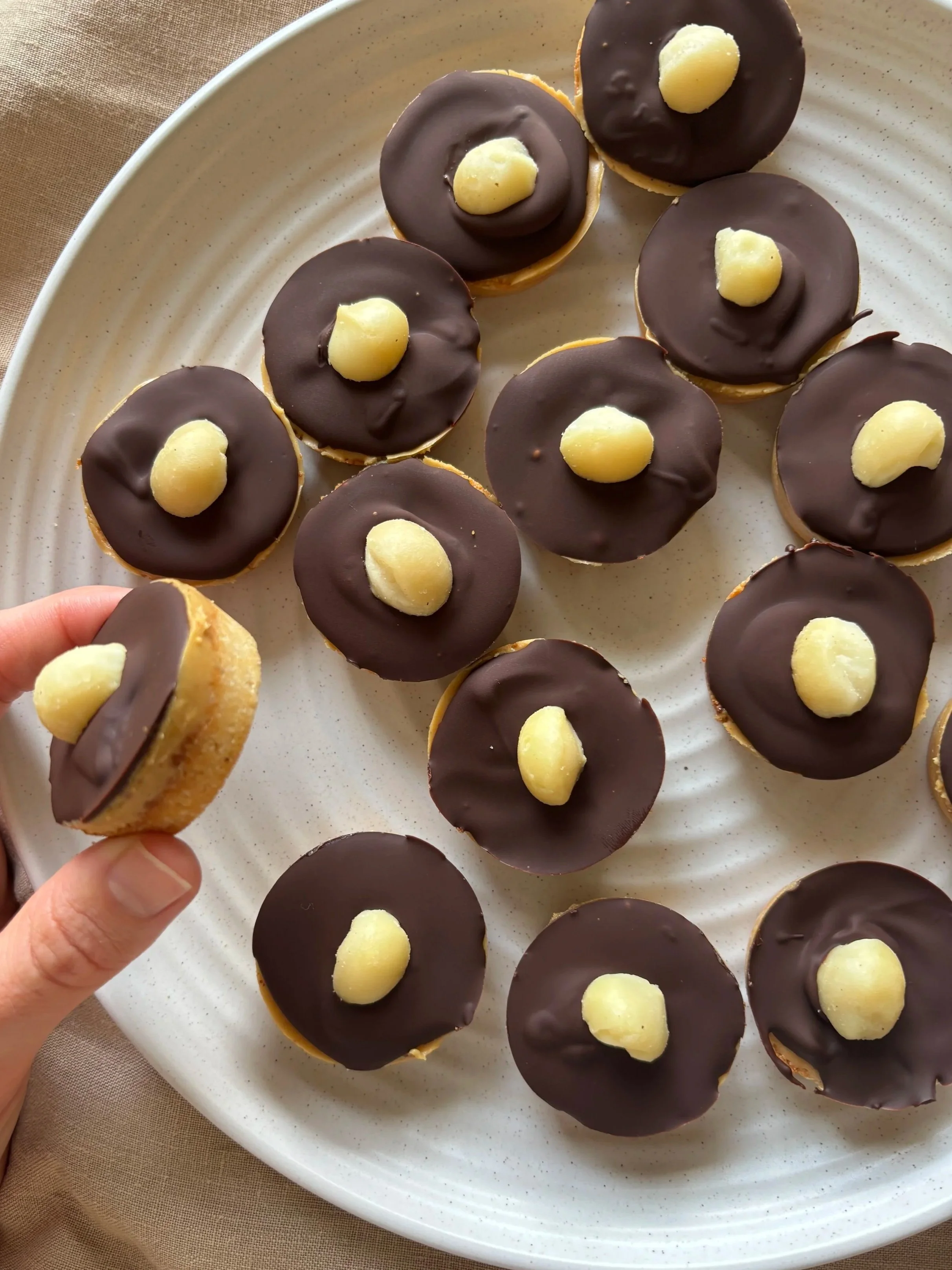Mix all base ingredients together until a dough forms. Press into a mini muffin silicone tray and bake in the oven for 10 mins or until golden. Then let completely cool.